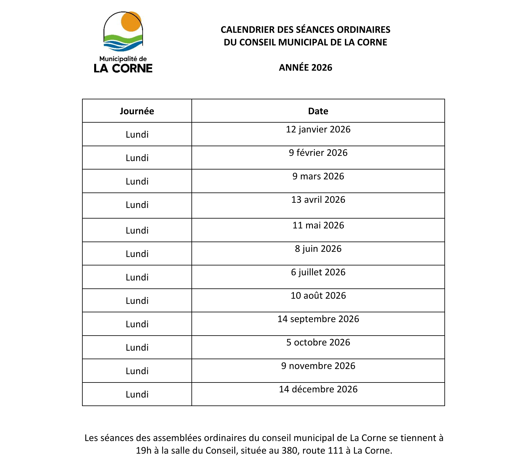 Les séances des assemblées ordinaires du conseil municipal de La Corne se tiennent à 19h à la salle du Conseil, située au 380, route 111 à La Corne (Salle Champagne).